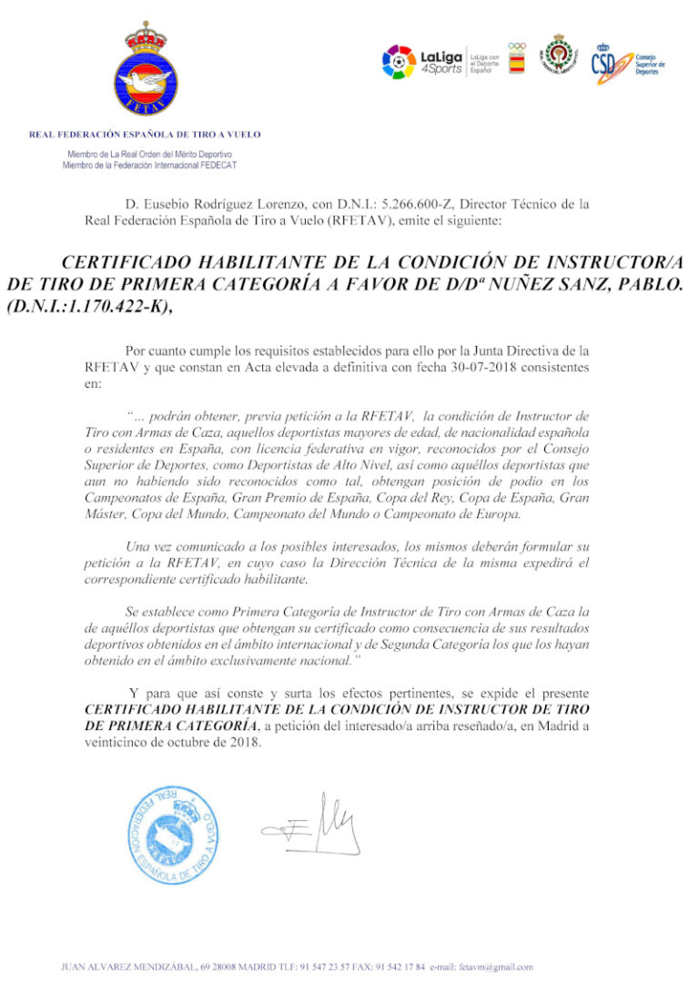 Las clases son impartidas por un Instructor de Primera Clase, certificado por la Real Federación Española de Tiro a Vuelo.